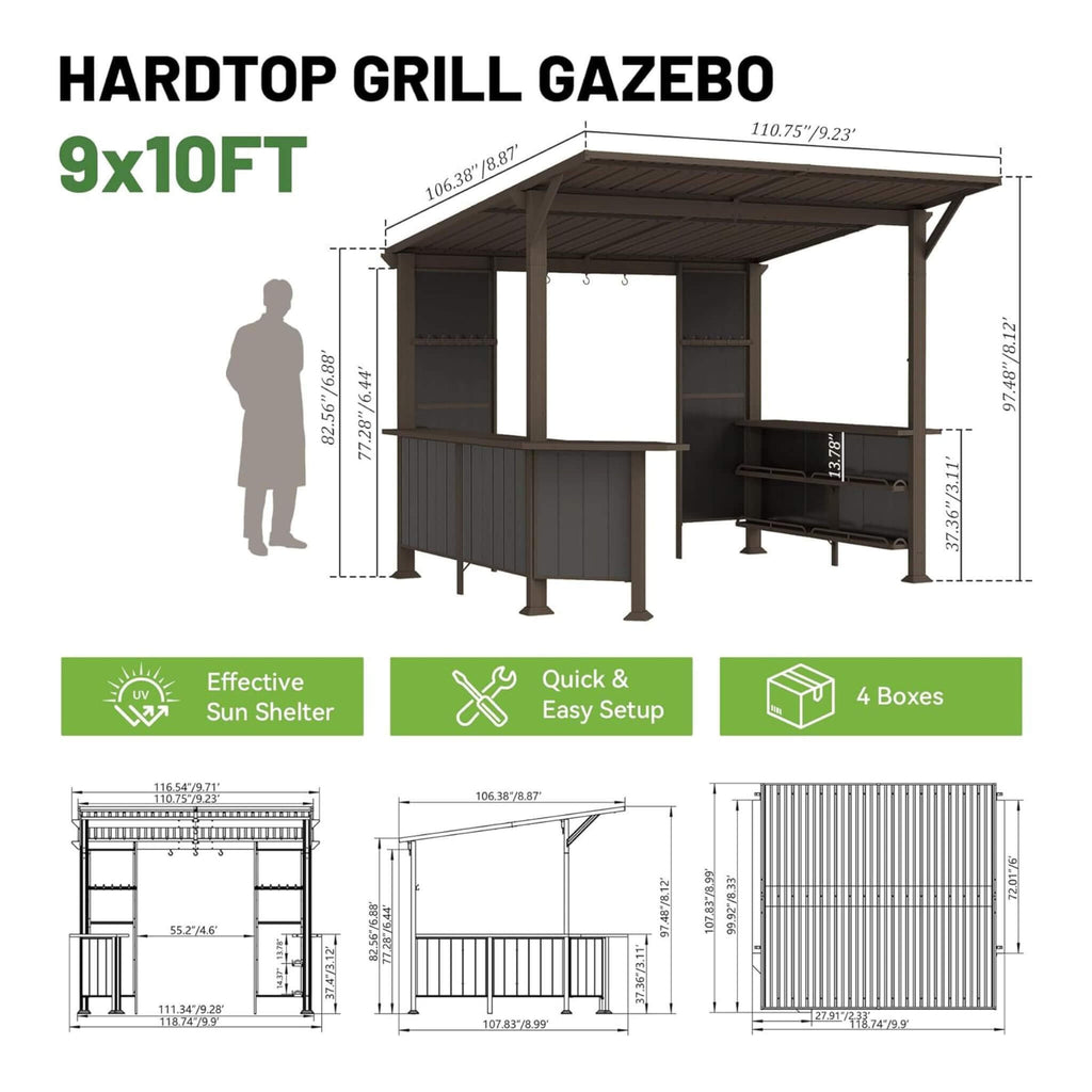 - The 9x10ft footprint offers ample room for grilling and entertaining, featuring a modern aesthetic that complements any outdoor decor.