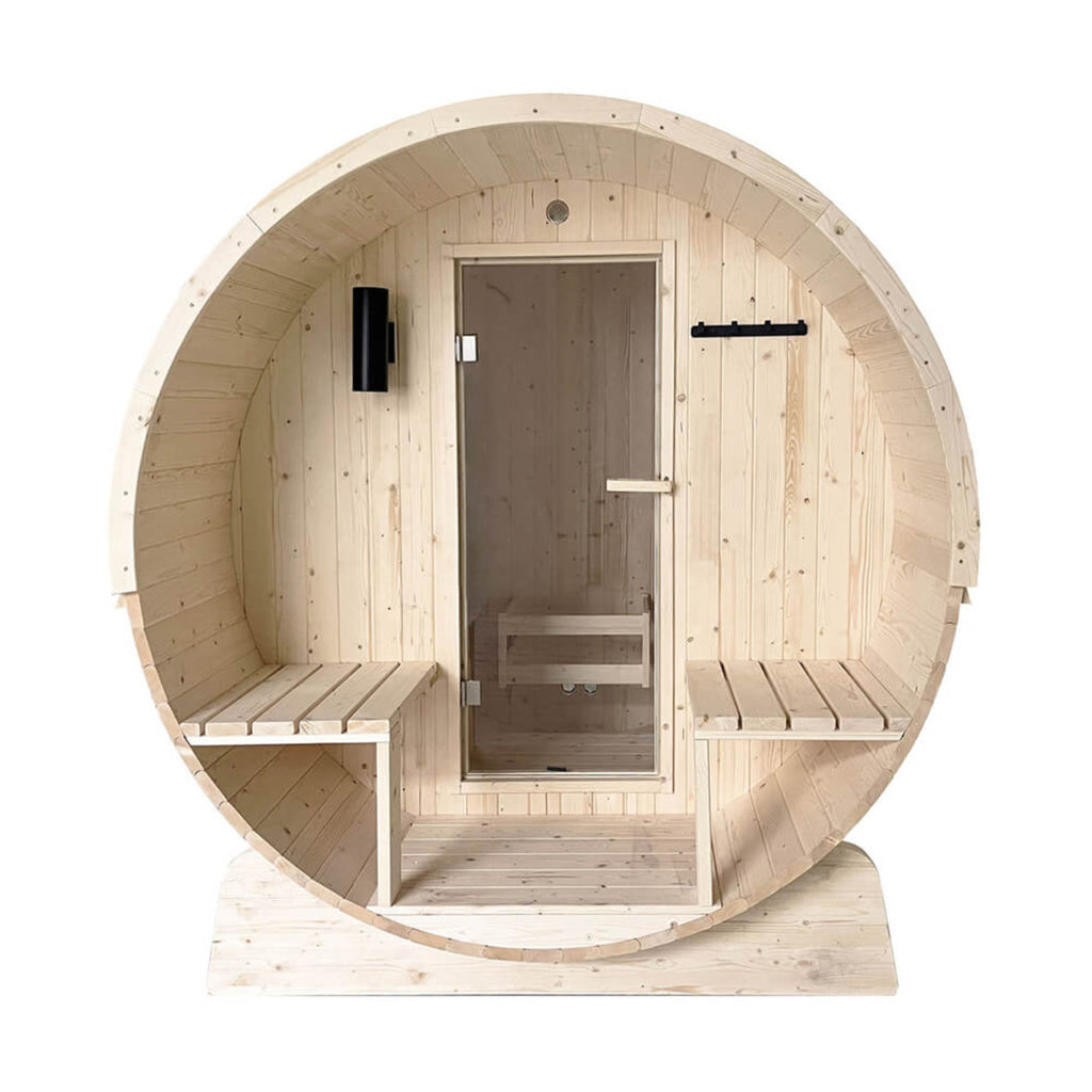 - Built to last from robust White Finland Pine and reinforced with stainless steel bands, this sauna features a functional barrel shape for consistent heating and a tinted glass door that offers privacy while letting in warm, natural light.