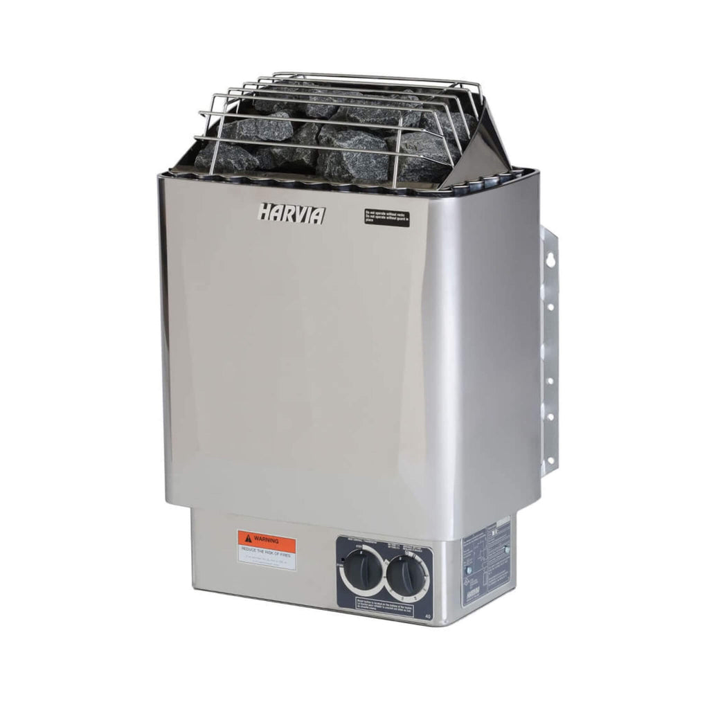 - Experience the power of the premium 4.5 kW Harvia KIP stainless steel heater! This high-performance unit gives you total control, allowing you to dial in your perfect climate between 158-194 degrees Fahrenheit. Want to elevate the experience? Use the included bucket and scoop to pour water over hot stones for a blissful, invigorating steam!