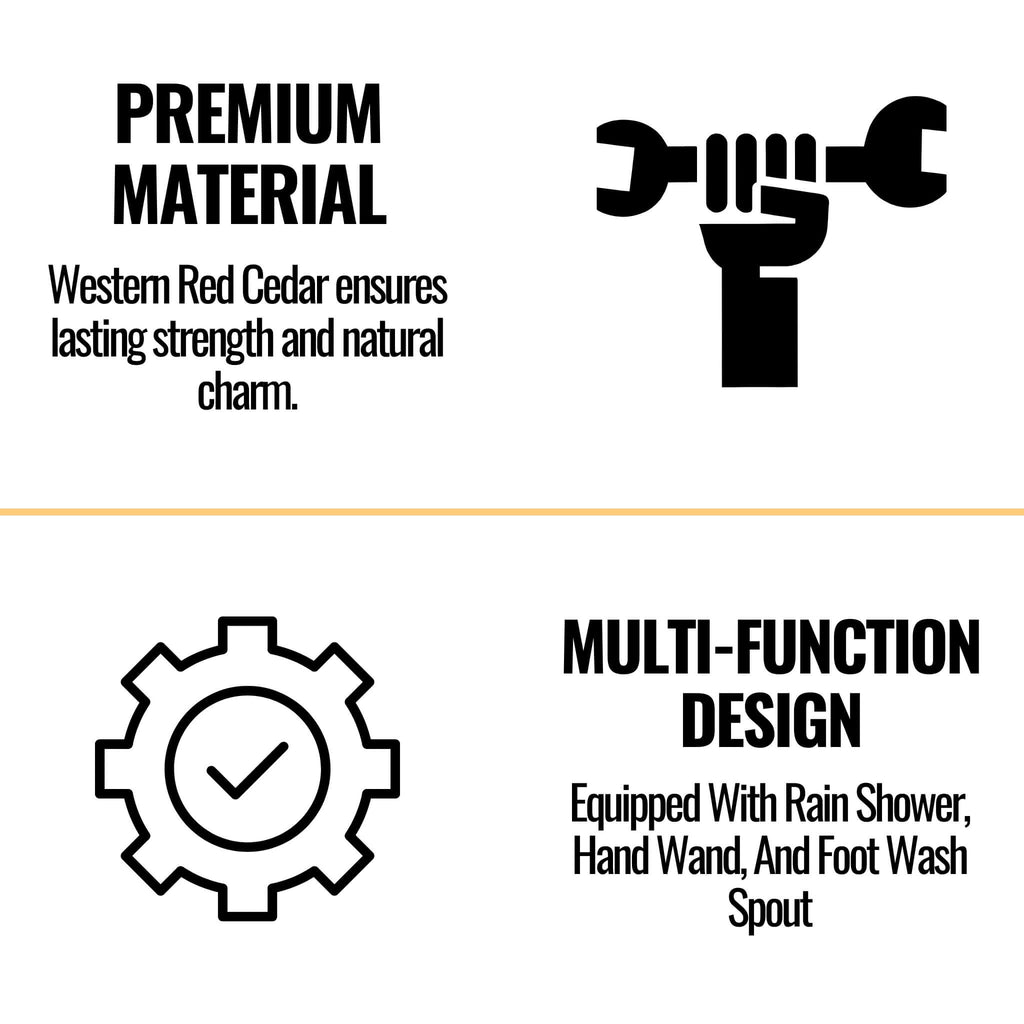 Crafted from premium Western Red Cedar, our shower enclosure is not only a feast for the eyes but also built to stand strong against the elements. The natural grain of the cedar brings an organic elegance to your space, while its inherent resistance to decay ensures lasting beauty and utility.