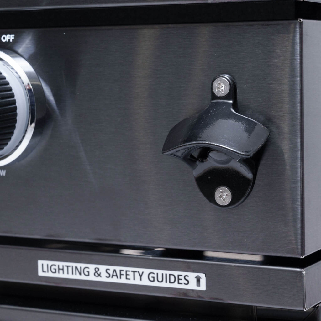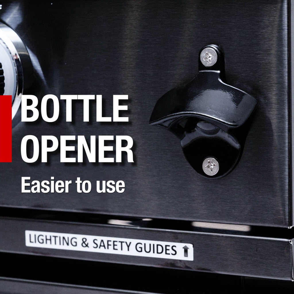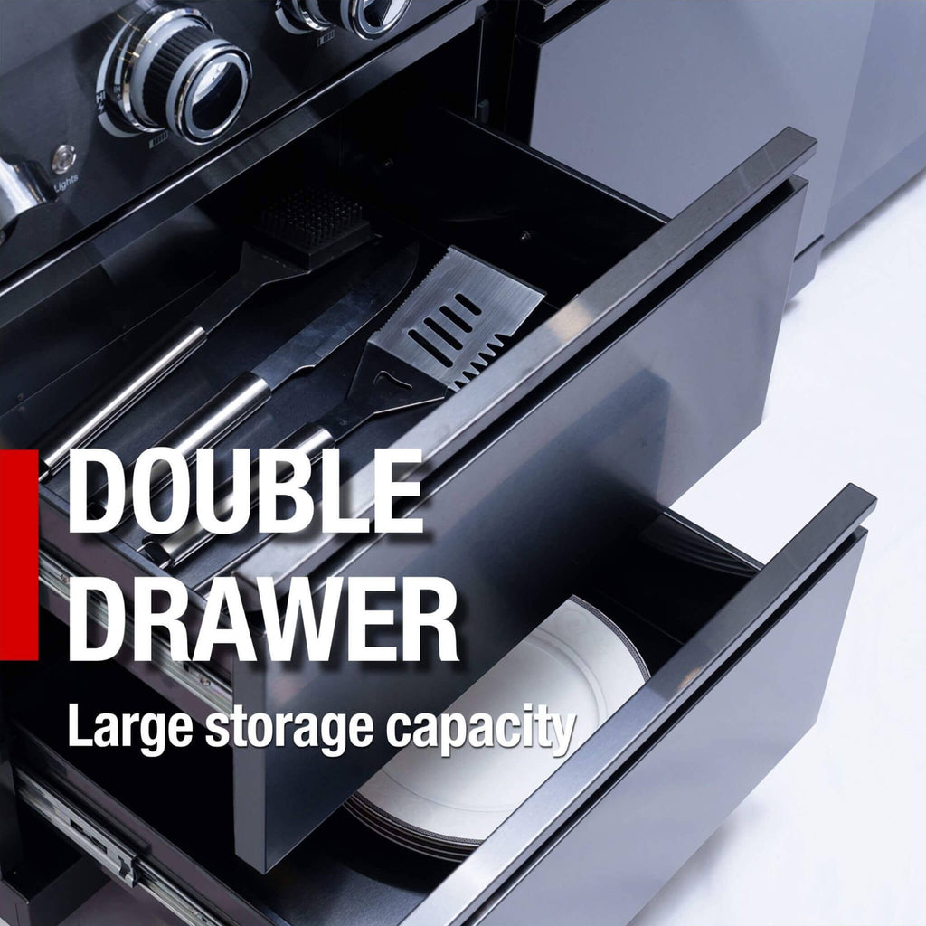 - Arriving fully assembled, this kitchen is ready for immediate action with gliding castor wheels for easy placement. It’s packed with user-friendly features like electronic ignition, a built-in bottle opener, ample storage drawers, and a full front pull-out grease tray for simple, hassle-free cleaning.