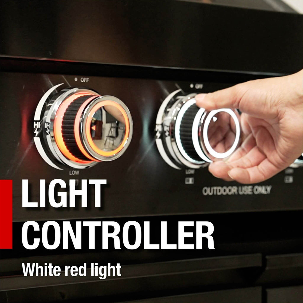 - This grill island features stunning black galaxy granite countertops and a sleek black stainless steel body that adds a touch of modern luxury to your patio. For enhanced ambiance and visibility, it includes two internal halogen cooking lights and control knobs that illuminate from white to red when in use.