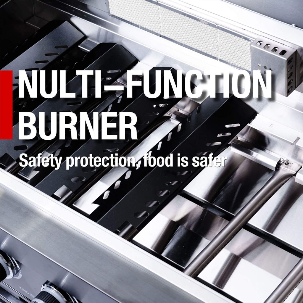 - Command a massive 990 square inches of total cooking space, powered by six high-efficiency stainless steel burners and a rear infrared burner that together produce an incredible 85,000 BTUs of heat. The included 120V heavy-duty rotisserie kit can handle up to 25 lbs, perfect for roasting whole chickens and large cuts of meat to perfection.