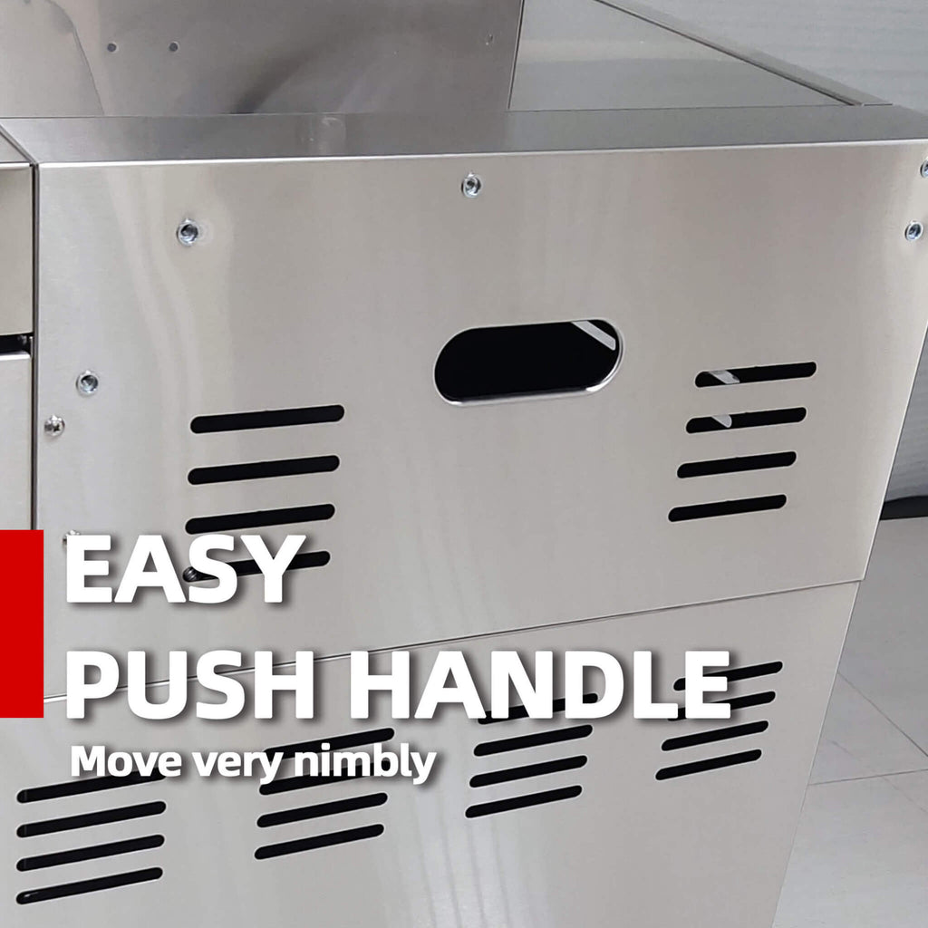This outdoor kitchen is packed with premium features designed for convenience and a superior grilling experience. Cook day or night with internal halogen lights and stylish LED-lit control knobs. Cleanup is a breeze thanks to the full front pull-out grease tray, and the elegant black granite countertops provide ample space for prep. With integrated storage cabinets, a built-in bottle opener, and smooth-gliding castor wheels for easy placement, every detail has been thoughtfully included to make your outdoor cooking effortless and enjoyable.