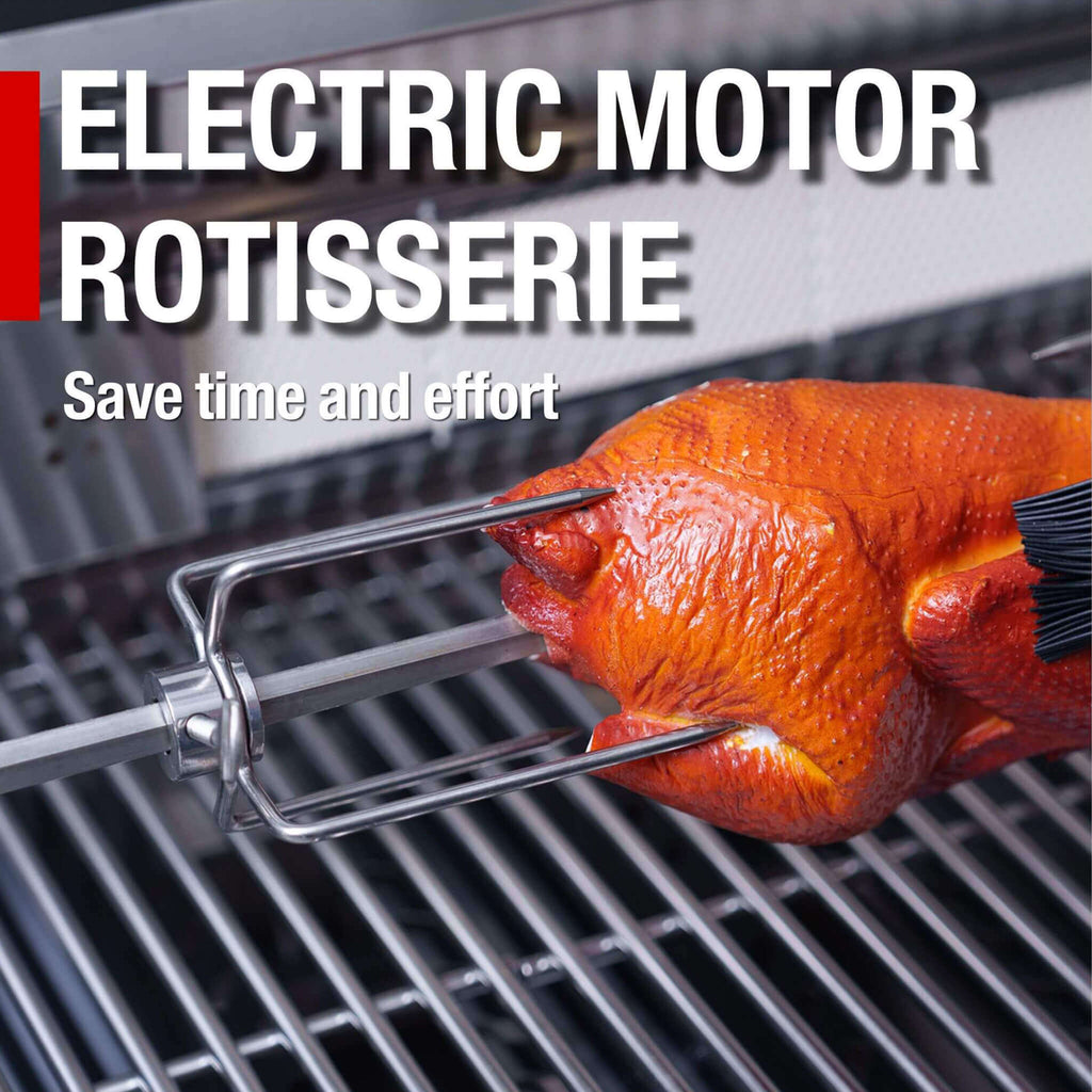 - Fire up an incredible 85,000 BTUs of total heat across four high-efficiency stainless steel burners, a ceramic infrared rear burner for the included rotisserie kit, and a standalone side burner for sauces and sides.