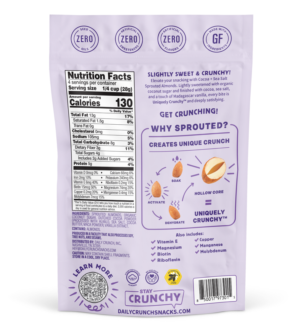 Elevate your snacking with Cocoa + Sea Salt Sprouted Almonds. Lightly sweetened with coconut sugar and finished with cocoa, sea salt, and a touch of Madagascar vanilla, every bite is Uniquely Crunchy™ and deeply satisfying.