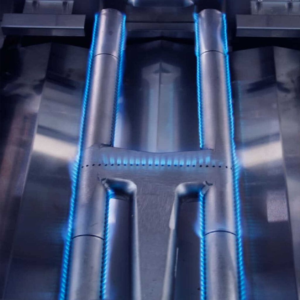 Experience unmatched versatility with the advanced camera systemâer, burner system! Three H-shaped cast stainless steel burners deliver 25,000 BTUs each, while a dedicated 14,000 BTU infrared burner creates restaurant-quality sears on steaks and chops. The stainless steel zone dividers let you maintain three distinct temperature zones simultaneously, so you can sear ribeyes on high heat while slow-cooking vegetables on medium. Plus, the included rotisserie with rear burner makes roasting a whole chicken or prime rib effortless. LED-lit control knobs and internal halogen lighting ensure precision cooking even after the sun goes down.
