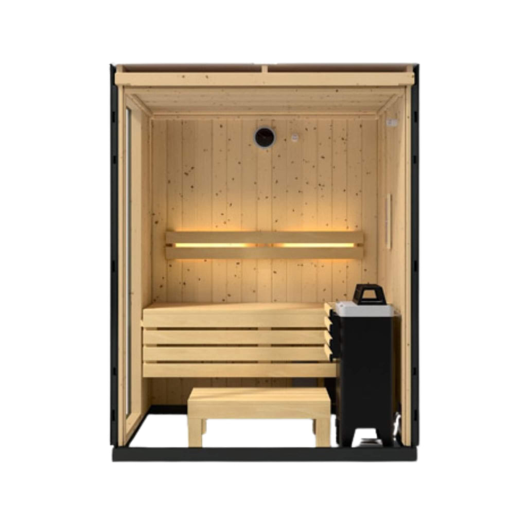 - The cabin is expertly crafted with tongue-and-groove connections for a seamless appearance, featuring a premium Scandinavian spruce interior, a modern Graphite Gray exterior, and 0.3-inch tempered glass doors with beech wood handles that remain safe and cool to the touch.