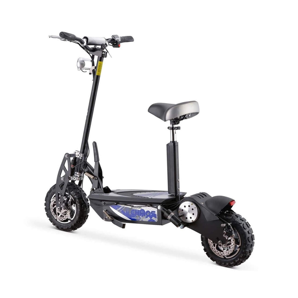 - The scooter comes with a quick-release, included seat and a foldable design featuring a Posi Lock mechanism. When folded, its dimensions are 46x25x21 inches, making it easy to store and transport.