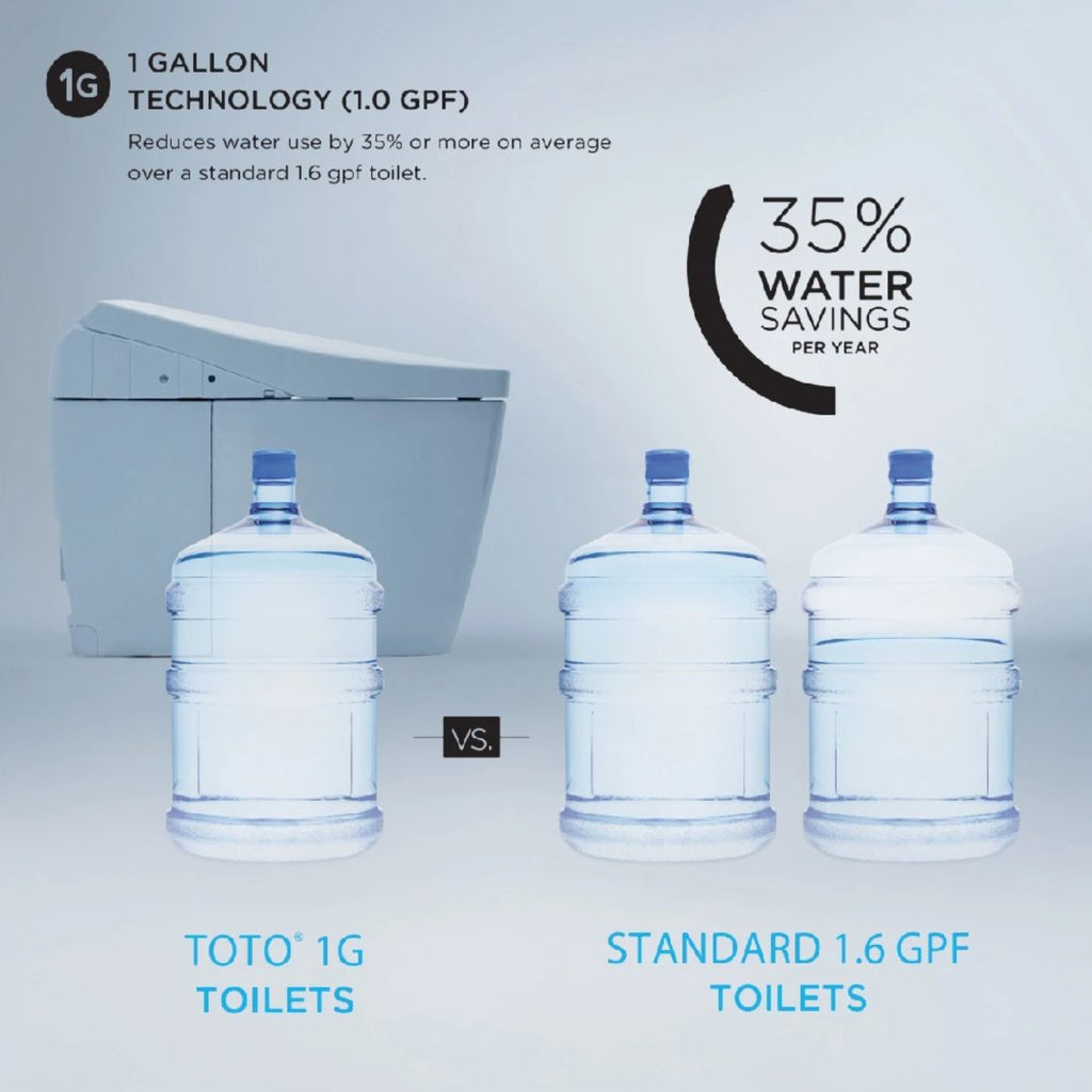 - Featuring TOTO’s 1G technology, this toilet uses only one gallon of water per flush while ensuring a thorough clean. The Tornado Flush with dual nozzles creates a cyclonic rinsing action that keeps the bowl spotless with less water..
