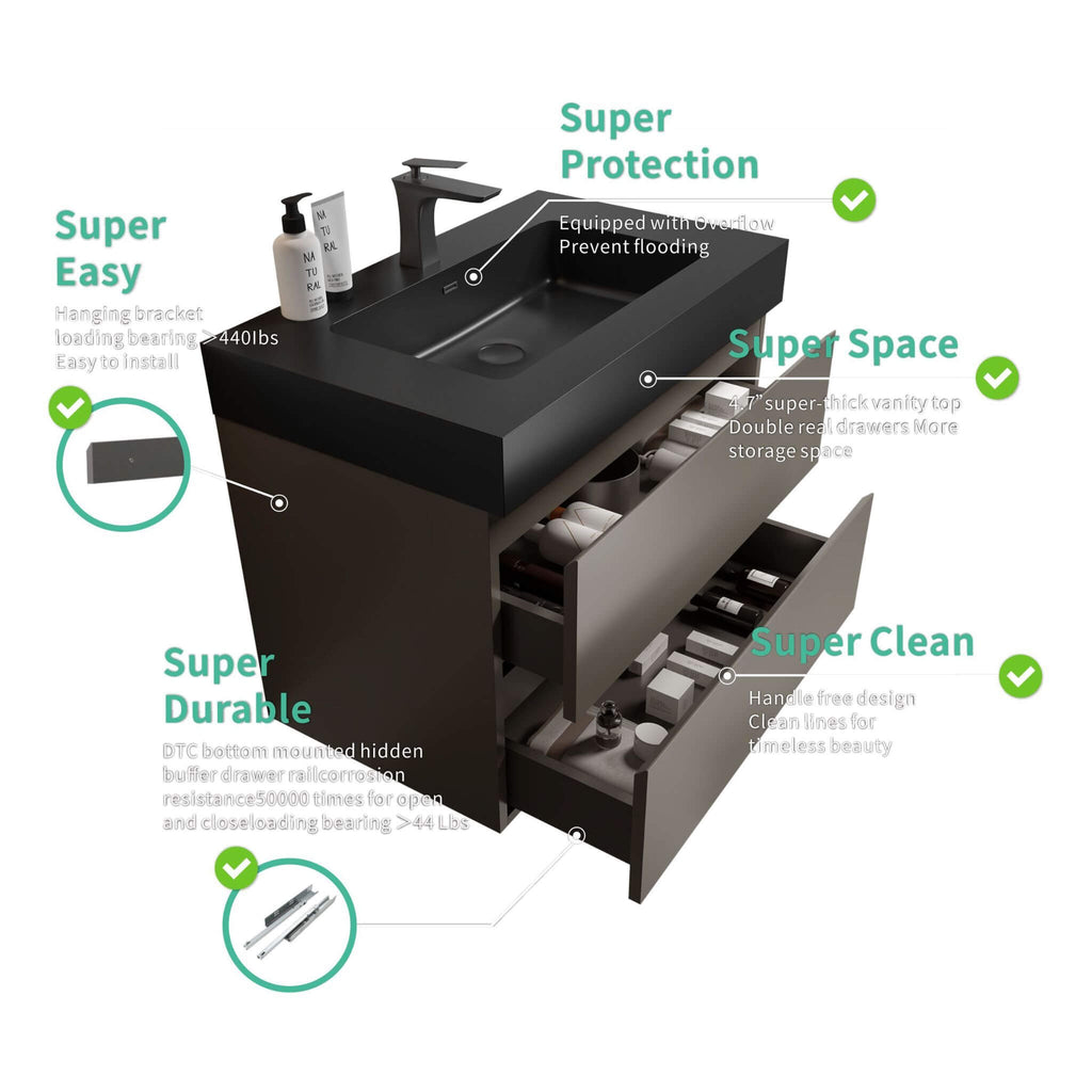 Redefine your bathroom with the Nuvia 30-Inch Wall-Mounted Vanity, a masterpiece of modern elegance and exceptional function. This stunning wall-mounted vanity combines a sleek, contemporary design with incredible practicality. Crafted with meticulous attention to detail, the Nuvia features a luxurious matt black engineered stone sink that adds a bold touch of sophistication to your space.