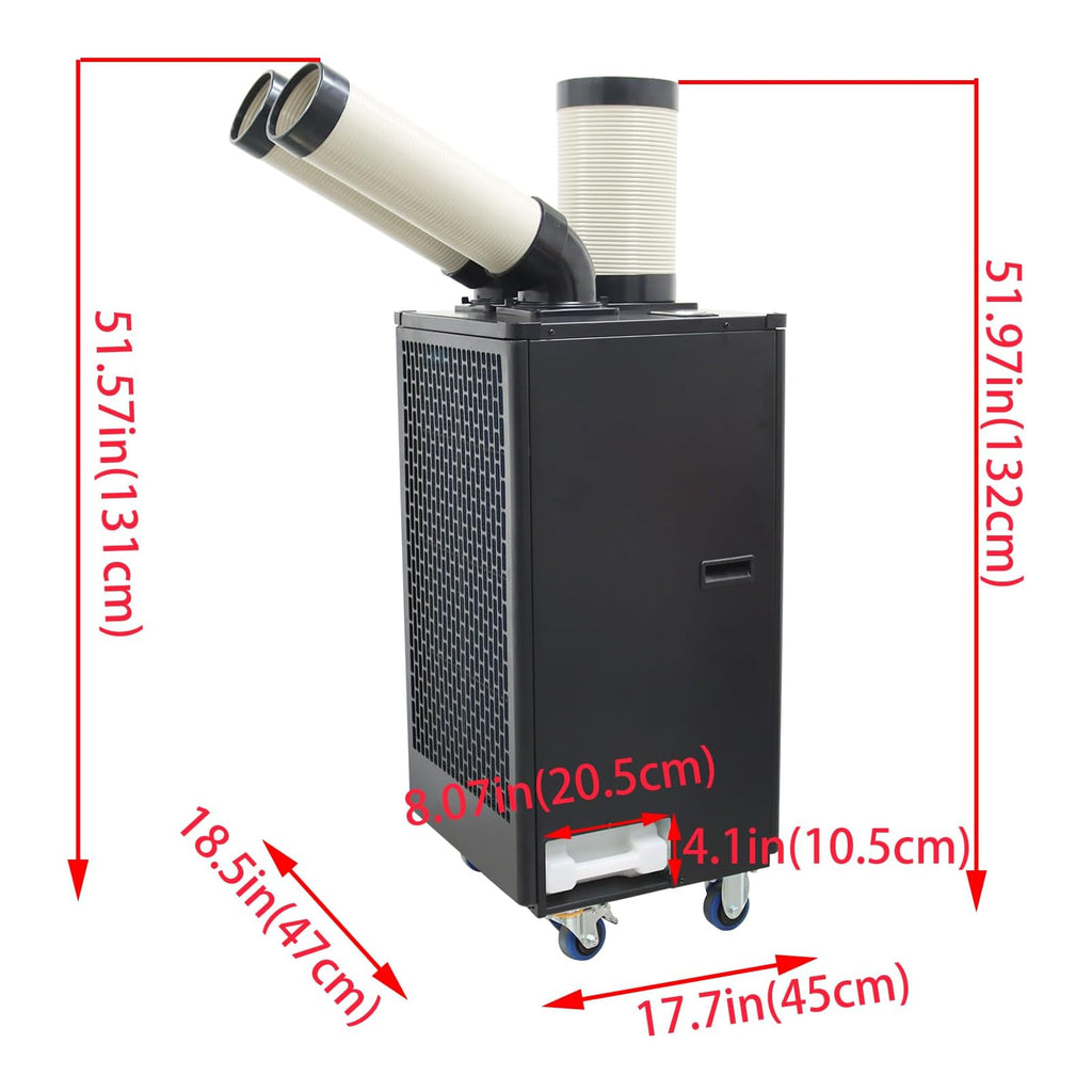 - Compact 5L spot cooler with 12000 BTU/h cooling power and 550m³/h airflow. Wheeled design for easy mobility across workshops, hospitals, and event spaces. 220V, 1.1KW commercial-grade performance.