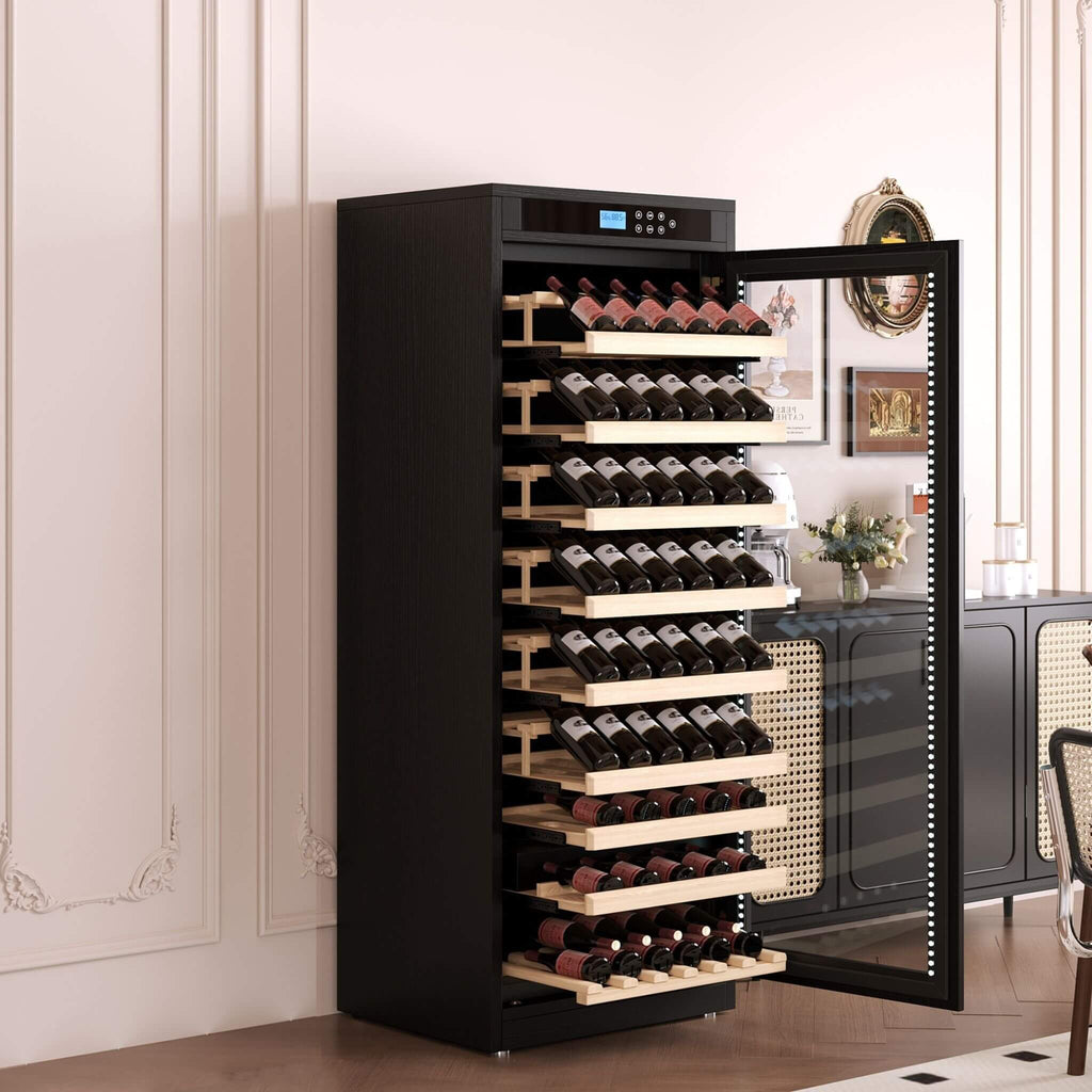 - A high-efficiency compressor cooling system operates with minimal noise and energy use, preserving your wine without disruption.